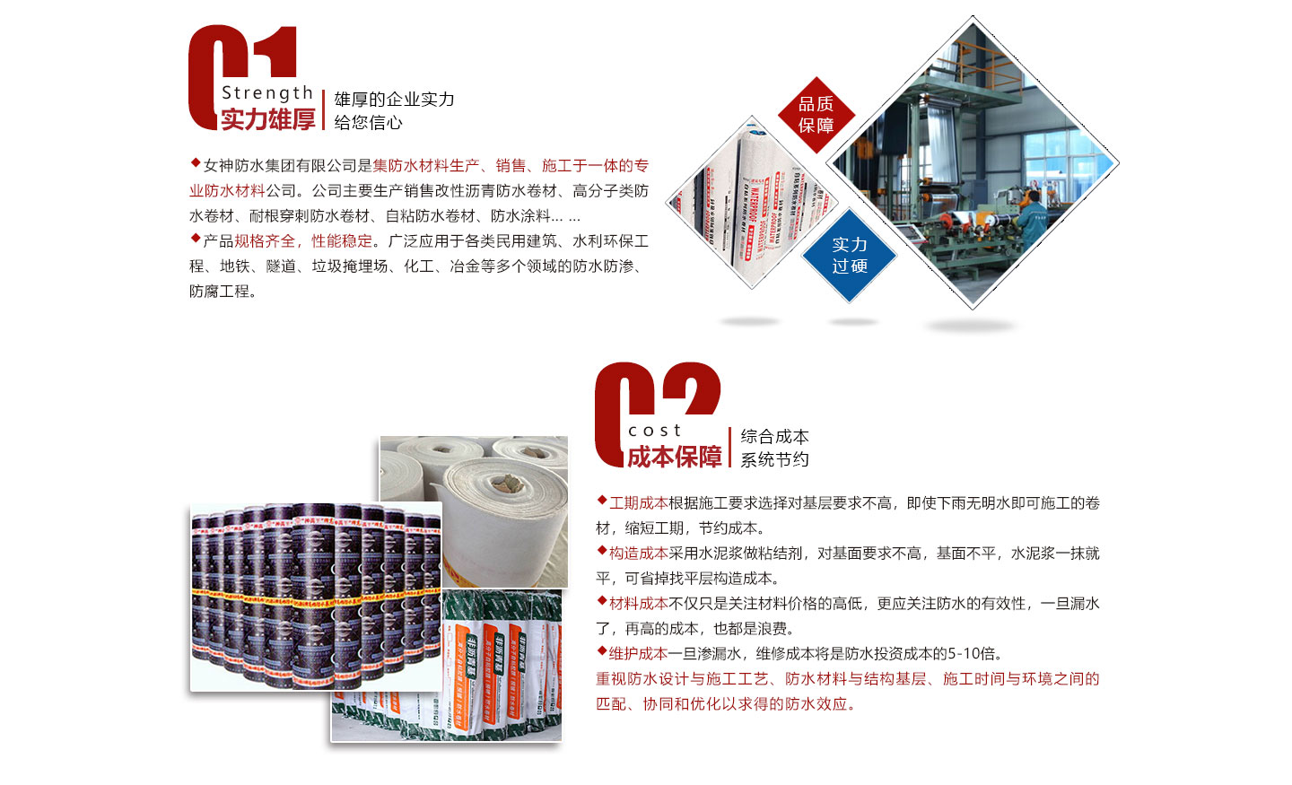 安徽女神建材科技集團(tuán)有限公司是集防水材料研發(fā)、生產(chǎn)、銷(xiāo)售、施工為一體的綜合性防水材料集團(tuán)公司。我公司旗下有多條大型一次成型生產(chǎn)線(xiàn):SBS改性瀝青防水卷材,DTM聚酯復(fù)合高分子防水卷材,非瀝青基高分子防水卷材,PVC,TPO高分子防水卷材等生產(chǎn)線(xiàn)。我公司秉承“創(chuàng)新發(fā)展、實(shí)惠用戶(hù)”為宗旨,確保生產(chǎn)材料基礎(chǔ)上推出“共享生產(chǎn)廠家”,為開(kāi)發(fā)商、建筑商節(jié)約成本為理念,新理念受到用戶(hù)企業(yè)集采時(shí)一致好評(píng)和認(rèn)可。在互聯(lián)網(wǎng)時(shí)代,我公司將以互聯(lián)網(wǎng)“共享”為發(fā)展理念,為開(kāi)發(fā)商、建筑商、防水企業(yè)提供的產(chǎn)品,真正讓用戶(hù)企業(yè)達(dá)到巨大...